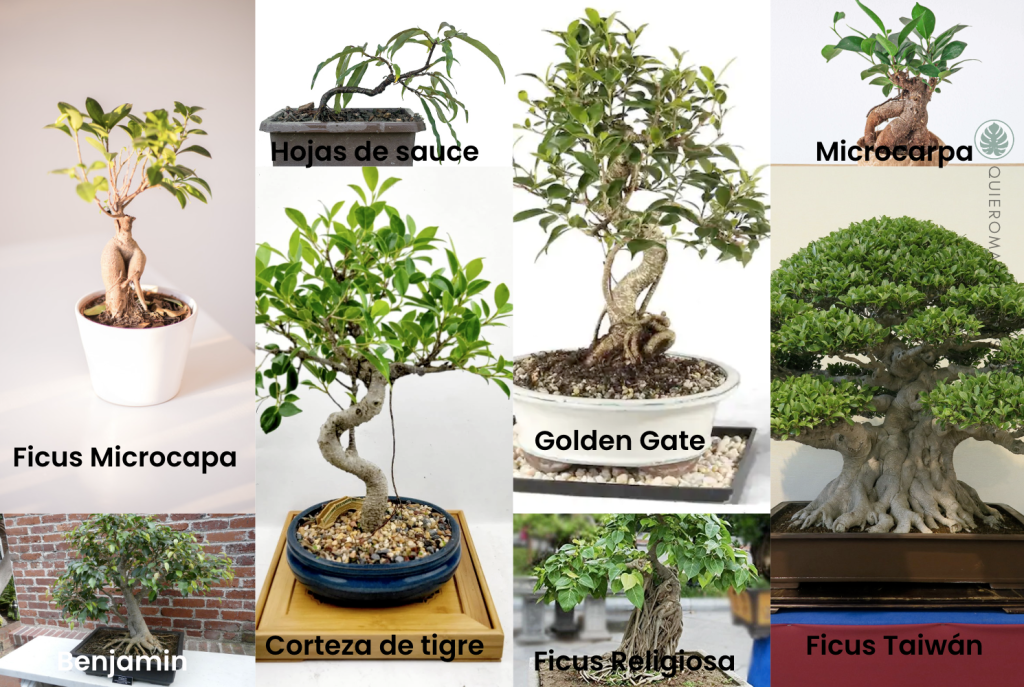 El Ficus Microcarpa, el Ficus Hoja de Sauce, la Corteza de Tigre, el Golden Gate, la Religiosa, el Ficus Taiwá y el Ficus Benjamina.