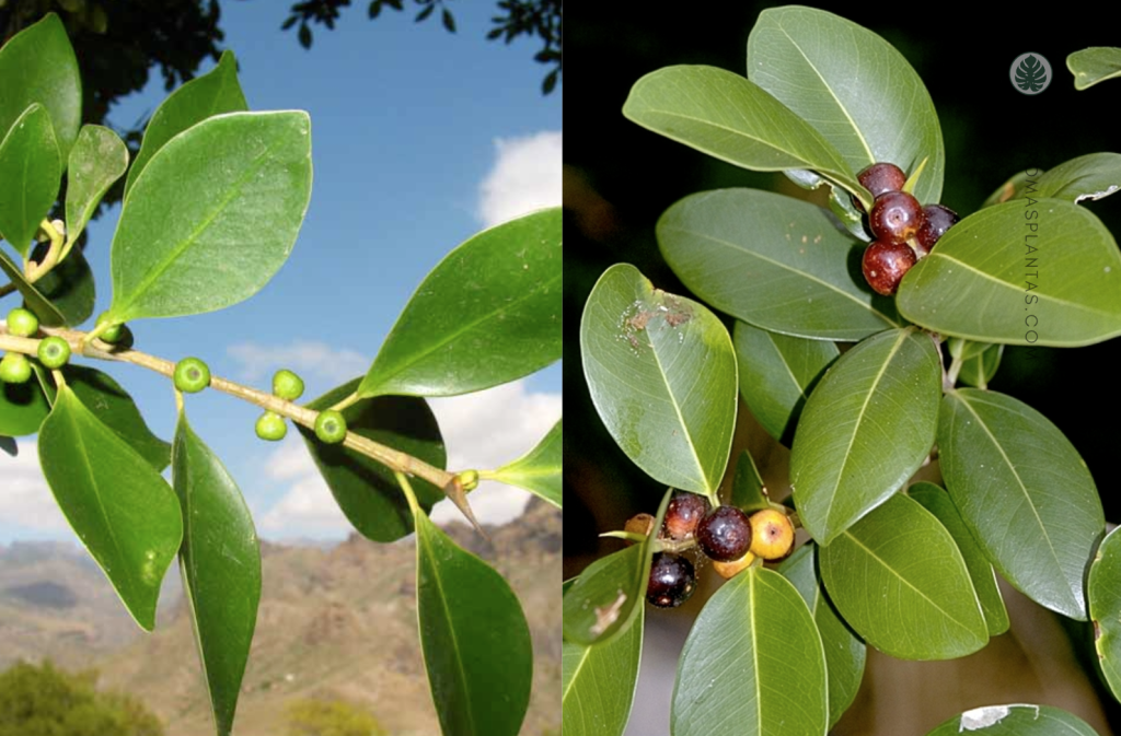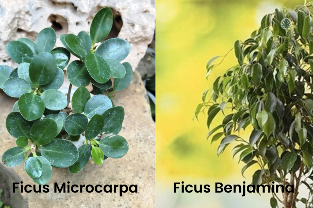 Existe un truco para diferenciarlo del árbol Ficus (F. benjamina) y el Ficus Microcarpa. Observa las puntas de las hojas: las hojas puntiagudas y afiladas pertenecen al Ficus benjamina, mientras que las puntas ligeramente redondeadas son del Ficus Microcarpa.