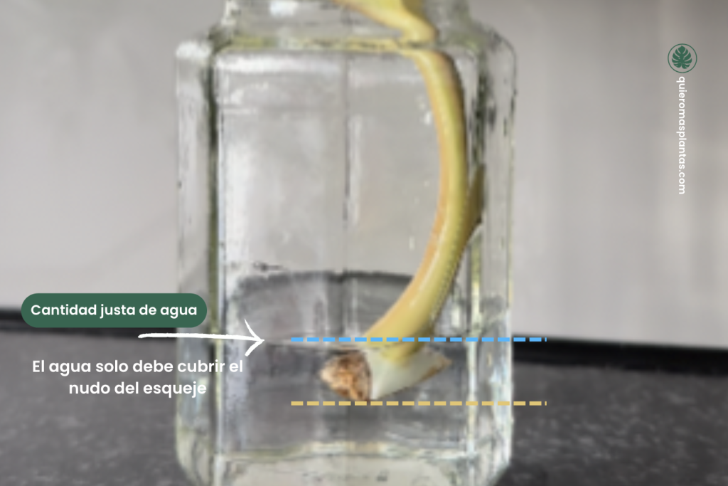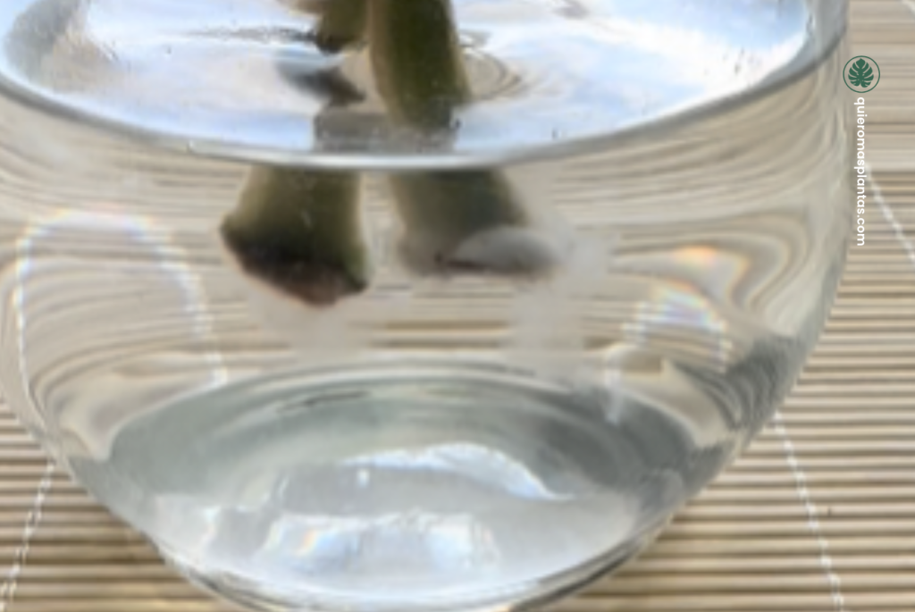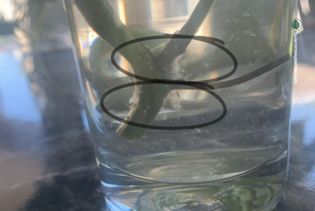 Recuerda solo exponer en agua los nudos: un bulto o protuberancia verde y saludable en el tallo donde emergen nuevos crecimientos y raíces.