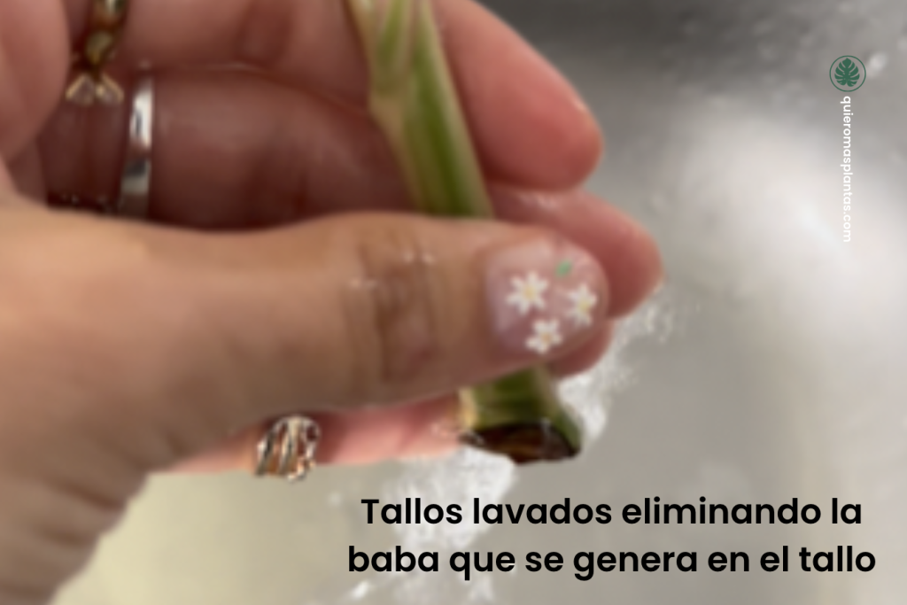 Lava tus esquejes para eliminar la baba o película bacteriana que puedas encontrar en tus tallos. Lleva tu esqueje bajo un chorro suave de agua y frota muy delicadamente todas las partes que puedas encontrar en esta película. Mucho cuidado de romper posibles protuberancias que tengan los esquejes, esas formaciones son las raices en pleno desarrollo.