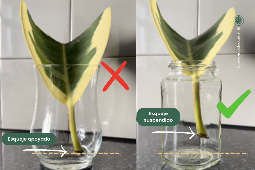 Mi recomendació es que tu esqueje siempre esté colgado, de ser necesario modifica el tipo de recipiente a utilizar o utiliza algú sistema adicional para mantener tu esqueje suspendido dentro del propagador.
