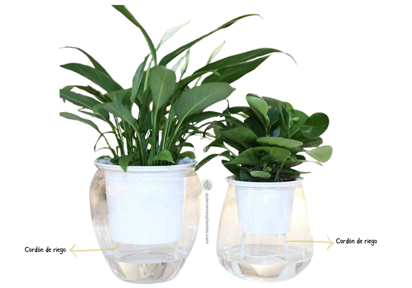 Con Cordó: Se utiliza un cordó absorbente que conecta el sustrato de la planta con un depósito de agua. El cordó transporta el agua por capilaridad directamente al sustrato.