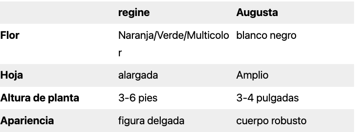 Aunque son variedades diferentes y miembros de la misma familia, son bastante diferentes en apariencia, incluido el color de las flores, el tamaño de las hojas y la apariencia general, como se resume en la siguiente tabla.